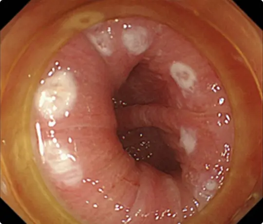 全周性のESD後です。穿孔(壁に穴があくこと)などの問題なく、病変を切除しました。切除後は潰瘍が出来ますが、1~2ヵ月で治ります。