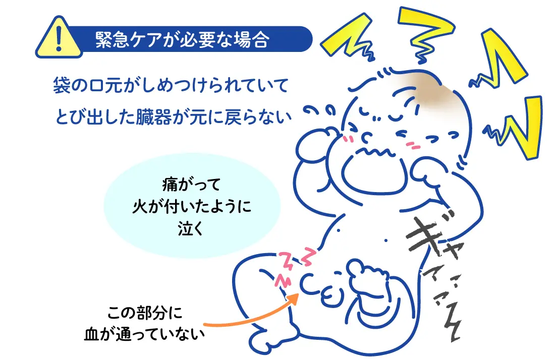 鼠径ヘルニアは、赤ちゃん30人に1人の割合で存在するといわれており、子どもでは頻度の高い病気です。この病気は、おなかを包んでいる腹膜から連続する袋がおなかの外へ延びたままになっており、この袋の中に腸管や卵巣が入り込むようになった状態です。女児では子宮を支える靱帯の1つ(円靭帯)が、男児では精巣が下降することに関与しています。この袋は生後には閉鎖するのですが、それが開いたままであることが原因と考えられています。中にはお水が溜まり、陰嚢水腫となることもあります。腸管が袋の中に入り込んできても、おなかの中に容易に戻る状態であれば心配する必要はありませんが、脱出した腸管が腹腔内に戻らなくなる「嵌頓(かんとん)」という状態では注意が必要です。嵌頓の状態では、子どもは機嫌が悪くなり、ふくらんだ部分は硬く、触ると非常に痛がり、次第におなかが張ってきて嘔吐するようになります。この状態を放置すると腸管の血行障害を起こし、最終的には腐った腸管を切除する緊急手術が必要になることもありますので、このような状態が疑われた場合、早めに来院して下さい。生後1年くらいまでは、この袋は自然に閉じる可能性があると言われていますが、それ以降は自然に治る可能性は少なく、治すには手術が必要です。