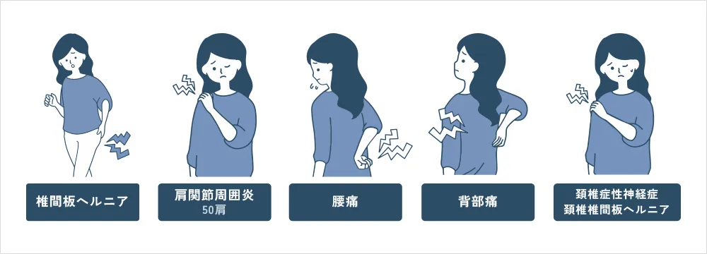 腰や下肢の痛み(椎間板ヘルニア、圧迫骨折、脊柱管狭窄症、変形性脊椎疾患など)、頸や肩の痛み、肩関節周囲の痛み(いわゆる五十肩)、緊張型頭痛、三叉神経痛、帯状疱疹痛(帯状疱疹のでき始めの痛み)、帯状疱疹後神経痛(帯状疱疹ができてから3ヶ月以上続く痛み)、腰椎術後の痛み、変形性膝関節症など