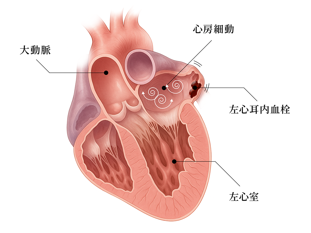 心房細動は、心臓の左心耳という部分に血栓ができやすく、脳梗塞をはじめとした塞栓症の原因になります。